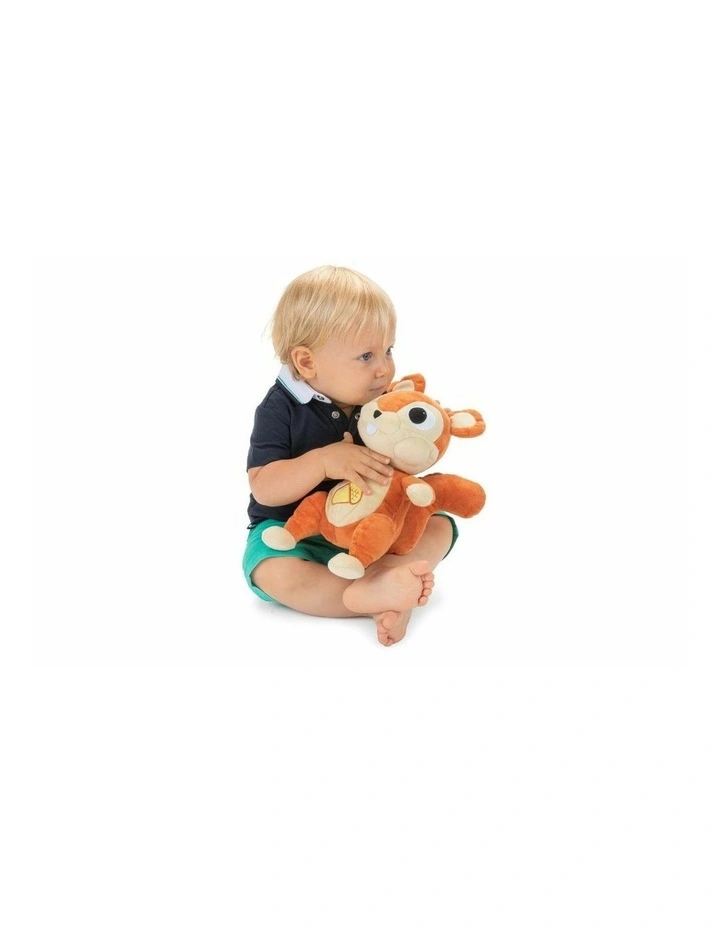 The acorn on the belly of Chicco’s Squirrel Lights & Sounds lights up with a yellow light when pressed and activates and deactivates light and musical effects that are played in automatic series of 15 or 30 minutes.Β Turning the puppet upside down, the squirrel emits a funny laugh that will involve the child. The electronic part of the Squirrel Lights & Sounds can be removed to wash the soft toy in the washing machine.