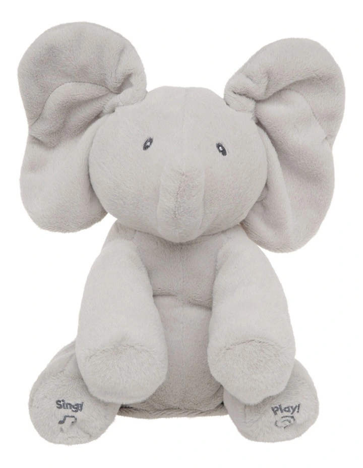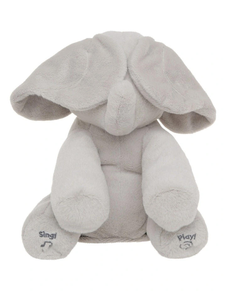 Flappy has two play modes – plays peek-a-boo when you press his left foot, or hear the song “Do Your Ears Hang Low” when you press his right foot. Ears flap during play to delight baby.