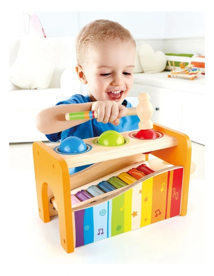 Explore the different notes and sounds by letting the balls fall on the keys or slide out the xylophone and create your own melodies with the wooden mallet! With The Pound and Tap Bench, there are many ways to make music!
