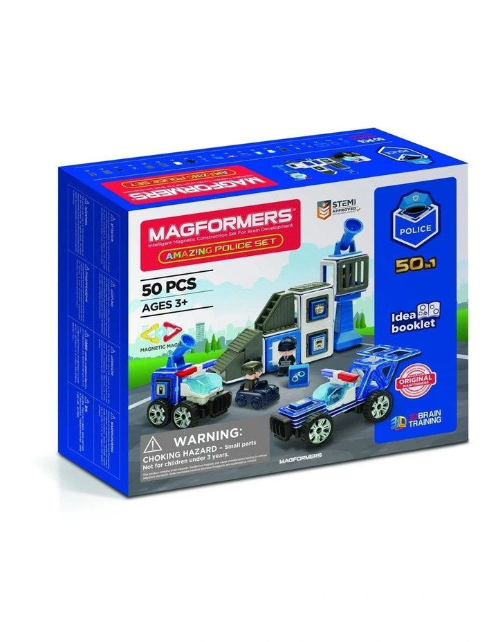 50-in-1!Build different police themed cars and buildings and help keep Magformers-Land a safe place.Set comes with 50 pieces which includes various police accessories. Including: Wheels, transformable police siren/propeller, policeman, thief and more.