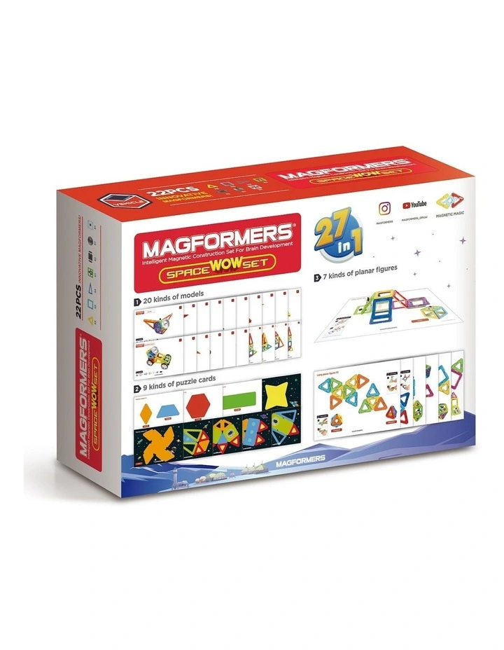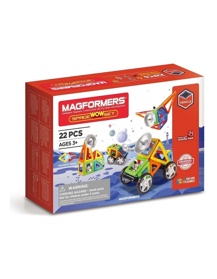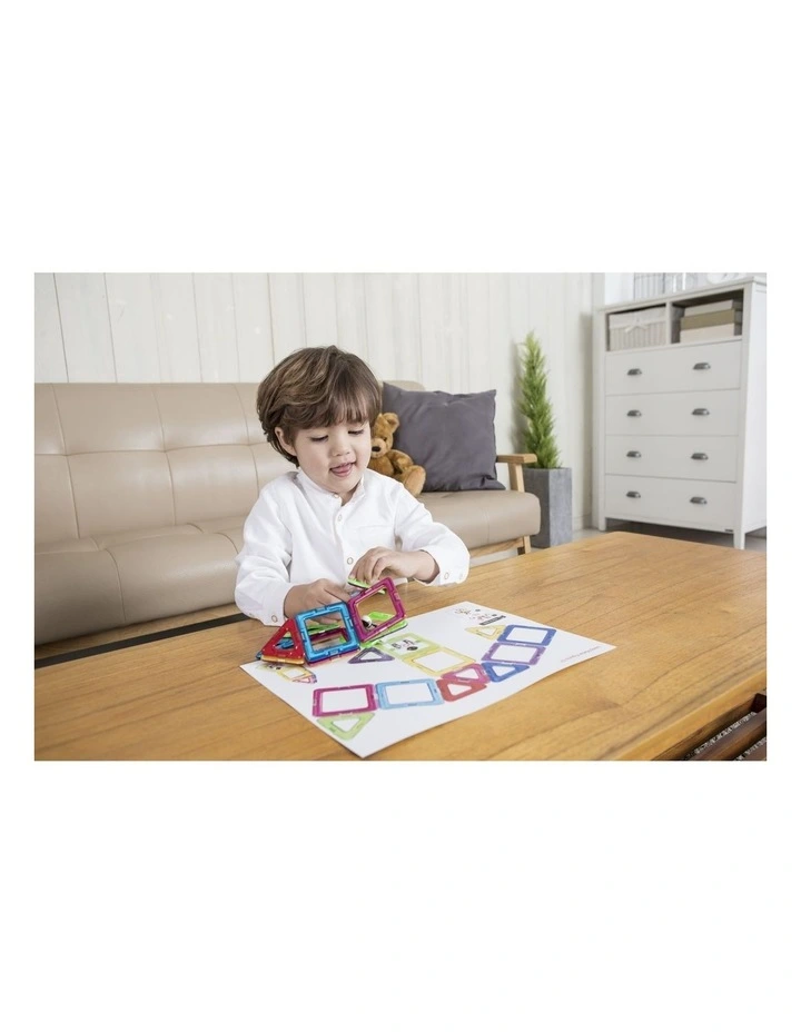 The set contains squares, equilateral triangles, isosceles triangles, an astronaut square, wheels, and an antenna / satellite dish.It also contains high quality, double-sided learning cards, which facilitate the main principles of playing with MAGFORMERS, and inspire creative ideas for children of all ages.