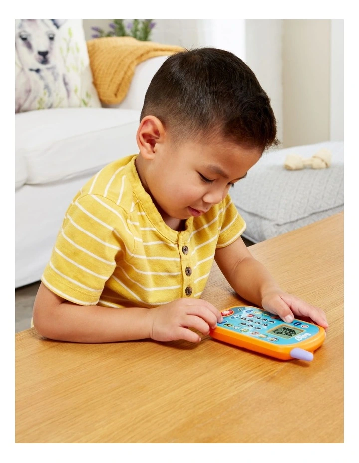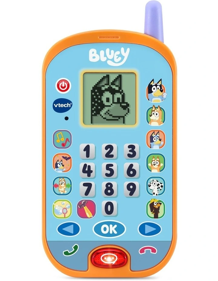 Lets play and chat with Bluey and Bingo on the Bluey Ring Ring Phone. Play games and activities that feature animations of the characters and popular phrases from the show. Press the buttons with pictures of Bluey, her family and friends to hear phrases about each one. Voice activation lets kids chat with Bluey and Bingo for interactive pretend play. Change the ringtone, brightness and more, just like a real phone. Play four games that feature themes from different episodes. If Bingo is in a bad mood, cheer her up by pressing the number buttons to play music she can dance to. Use the arrow buttons to help Bingo do a handstand. When Bluey pretends to be a fruit bat, press the arrows to help her catch fruit to eat. Help Bluey blow bubbles by blowing into the microphone. Lets do this!