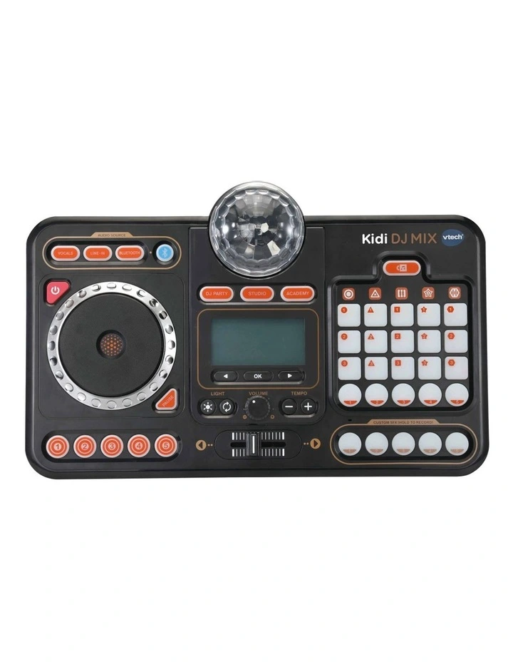 Be the star of the show with the Kidi DJ Mix! Scratch and jam to the music on the DJ turntable. Create custom mixes playing along with the 15 included songs or connect to your own music player, via Bluetooth wireless technology or audio cable. Play with the sound grid to create 2000 sound combinations! Record your own custom sound effects and tags with the internal mic. Dial in the effects with the sliders to get your remix just right. Add and remove vocals and effects, fine tune the mix, and record your mash-up. Use the headphone jack to listen, or play back your tracks for all your fans to hear through the built-in speaker. Get the crowd going with dazzling party lights on your DJ rig. Build your DJ skills by following the rhythms in a music game. Crank up the volume and get the party started!Β