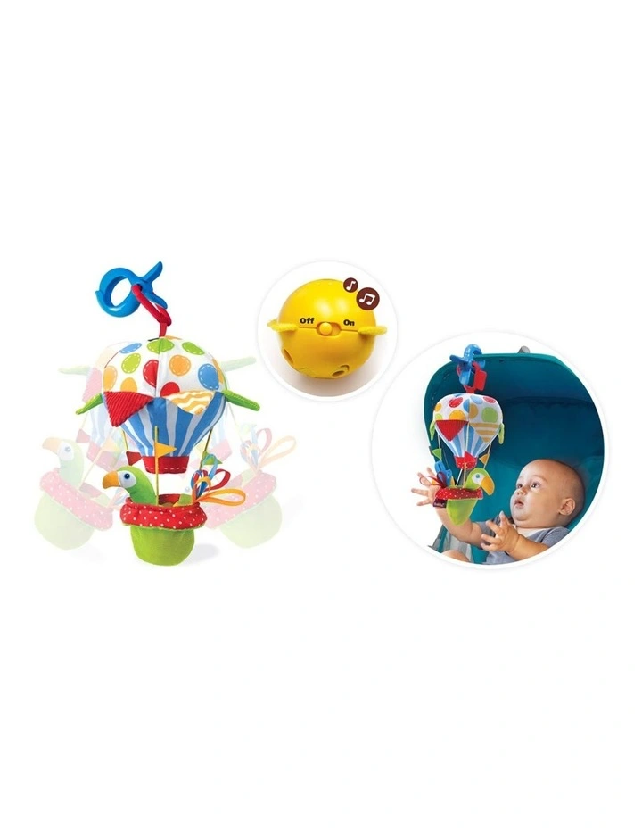 Motion activated stroller toy with sound effects and music.Tap the hot air balloon basket for a musical feedback.Includes multiple textures and rattle rings.Includes a Yookidoo alligator clip for attaching to strollers, baby seat carriers and gyms.